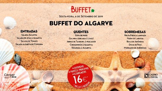 O restaurante ”Le Buffet” do Casino Lisboa sugere, para a noite de 6 de Setembro, um jantar temático dedicado ao Algarve. Trata-se de mais uma iniciativa gastronómica do Casino Lisboa que propõe, desta vez, um menu com as melhores iguariasdesta região. A não perder, a partir das 19h30. Preço por refeição de €16,00 por pessoa com bebidas incluídas.