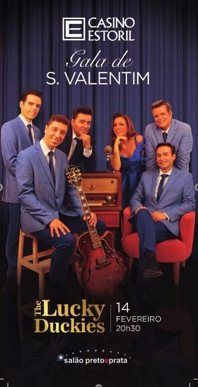 Com uma original proposta para o “Dia dos Namorados”, o Casino Estoril convida os seus visitantes a jantar no Salão Preto e Prata e, posteriormente, a assistir a um concerto especial da banda The Lucky Duckies. Trata-se de um programa único, pleno de romantismo que culmina com a actuação da mais mediática banda portuguesa de Vintage Swing & RocknRoll. O convite está marcado, para 14 de Fevereiro, a partir das 20 horas. Preço: 50€ por pessoa.