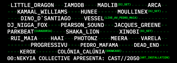 Esta é parte da definição do projecto que tem colaboração do colectivo KSH.KSH em colaboração com Afonso De Matos, reforçando o carácter multi-disciplinar do festival, não se cingindo a música em exclusivo. Apresentando-se como “comunidade” na rede social Instagram, 00:NEKYIA COLLECTIVE define-se tendo como mote “erasing virtual & physical barriers worldwide”, tendo por base uma expressão artística que combina som e imagem.