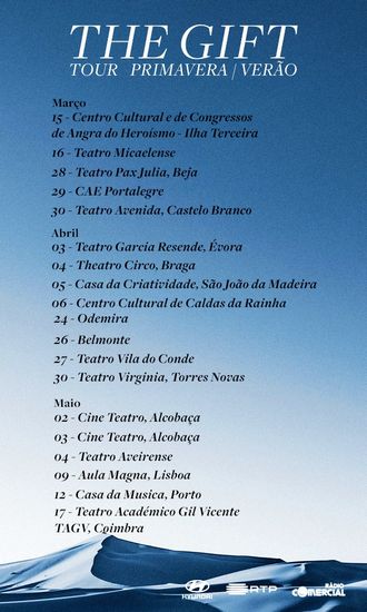 As restantes datas da Tour Primavera / Verão, já anunciadas, mantêm-se e nos próximos meses de abril e maio os Gift vão passar por alguns dos mais emblemáticos teatros de todo o país, convidando o público a revisitar a "Primavera" e a descobrir o novo disco "Verão", em primeira mão, ao vivo.