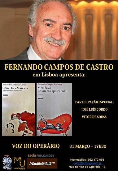 Um dos escritores e poetas nortenho mais acarinhado e cantado da actualidade, Fernando Campos de Castro, irá estar em Lisboa para apresentar dois dos seus livros: “Com Hora Marcada” e “Memórias de Um Cão Aposentado”. Este evento é organizado pela produtora Música Unida em parceria com a Voz do Operário e Seda Publicações, conta com a participação especial do poeta José Luís Gordo e do actor Vitor de Sousa.