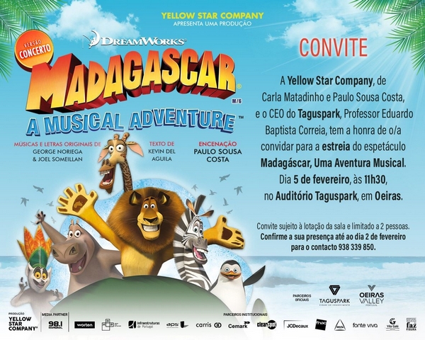 A Yellow Star Company, de Carla Matadinho e Paulo Sousa Costa, apresenta “Madagáscar, Uma Aventura Musical”, no Auditório Taguspark, em Oeiras.