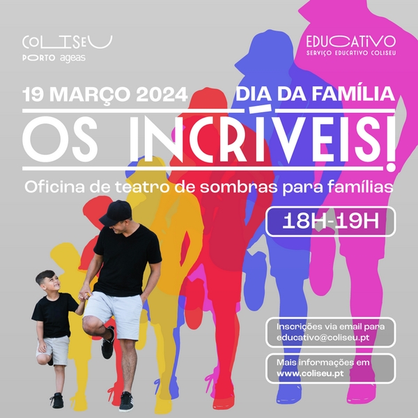 A 19 de março, às 18h00, todas as famílias são bem-vindas ao Coliseu para celebrar o Dia do Pai com uma atividade divertida, dirigida a crianças entre os 6 e os 12 anos, acompanhadas por um elemento da família, seja o pai, o tio, o avô, ou um bom amigo/a. “Os Incríveis! Oficina de teatro de sombras para Famílias” é uma oficina descontraída, pensada para reforçar laços e criar memórias, entre luzes e sombras, com desafios emocionantes para as incríveis super famílias.