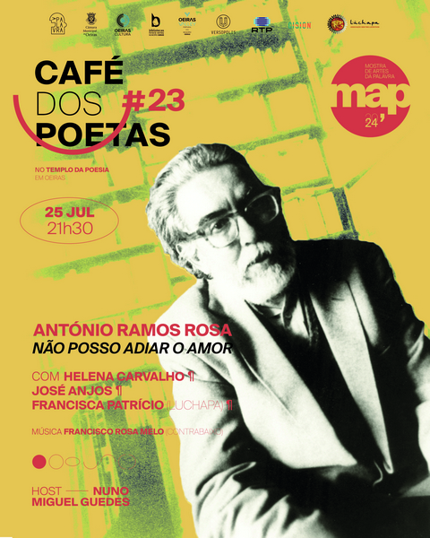 Inspirado nas tertúlias literárias, onde a conversa, a opinião e a leitura eram parte fundamental, o ‘Café dos Poetas’ é o local ideal para quem quiser experimentar de perto e de forma informal a paixão pela palavra. No mês de julho, o ‘Café dos Poetas’ abre as portas e tem como tema António Ramos Rosa: Não posso adiar o amor, com apresentação de Nuno Miguel Guedes (host), participação de António Bracinha Vieira, José Anjos, Helena Carvalho, Francisca Patrício (Associação Luchapa) e música de Francisco Rosa Melo (contrabaixo). A entrada é gratuita.
