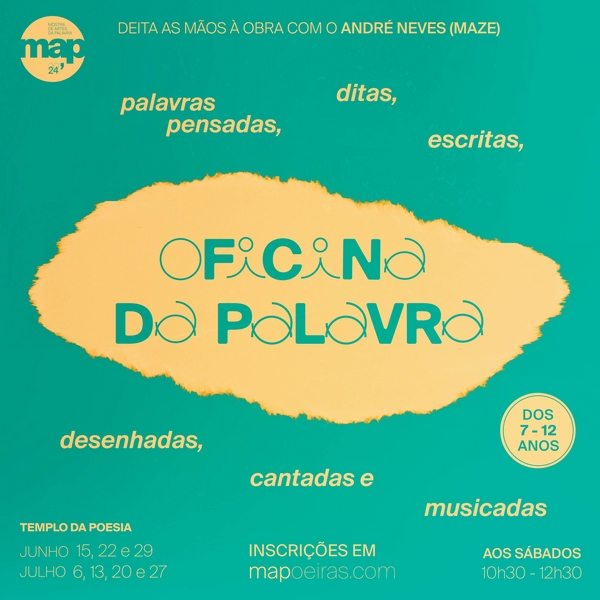 Nesta oficina orientada pelo rapper André Neves (também conhecido por Maze, dos Dealema), pensada para crianças dos 7 aos 12 anos, será cozinhada uma sopa de letras, para nela descobrir palavras, antigas e novas, refletir sobre as suas formas e significados, analisar os sentimentos que transportam e as emoções que despertam. Através de jogos, histórias, canções e poemas, a palavra ganhará vida de várias maneiras: pensada, escrita, dita, cantada, desenhada e até esculpida. A inscrição e participação são gratuitas.