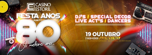 O Salão Preto e Prata do Casino Estoril recebe, no dia 19 de Outubro, pelas 21h30, a “Festa Anos 80 - Os Melhores Anos”. M/16. Preços: De 20€ a 35€.