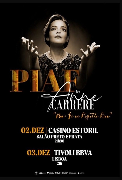 O Salão Preto e Prata do Casino Estoril recebe, no dia 2 de Dezembro, às 21h30, o espectáculo “Piaf! Non, je ne regrette rien!” by Anne Carrere. M/6. Preços: De 25€ a 65€.