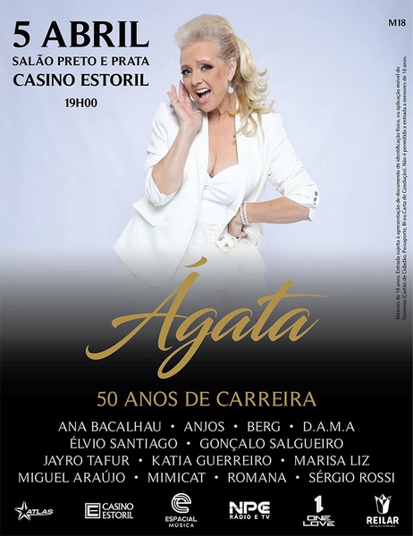 Ágata celebra 50 anos de carreira, no dia 5 de abril, no Salão Preto e Prata do Casino Estoril. O jantar de gala inicia-se às 19 horas, seguindo-se o concerto às 21h30. M/18. Preço: De 25€ a 150€.