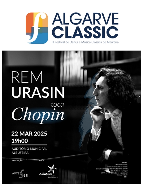 No âmbito do “Algarve Classic – III Festival de Música Clássica de Albufeira”, Rem Urasin toca Chopin a 22 de março, num concerto que promete ser memorável, marcado para as 19h00. De renome mundial, Rem Urasin é um exímio intérprete e um verdadeiro embaixador da obra de Chopin. Albufeira irá receber no final da tarde de sábado este intérprete apresentará um programa dedicado ao ilustre compositor polaco. Urasin começou a estudar piano aos cinco anos de idade na Escola Especial de Música do Conservatório de Kazan, na Rússia e tem obtido vários prémios internacionais, nomeadamente o “Prémio Chopin”, na Polónia. Destina-se a um público M/ 6, podendo os bilhetes (€10,00) ser adquiridos Plataforma BoL ou na Galeria Municipal João Bailote (dias úteis das 9h30 às 12h30; 13h30 às 17h00) ou ainda no dia e local do espetáculo (18h00 às 18h45).
