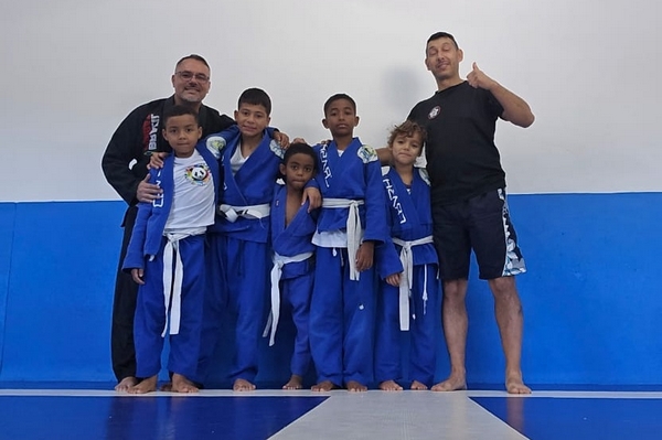 (Mestre William com algumas crianças no projeto Buscapé na Polícia Militar do Brasil)