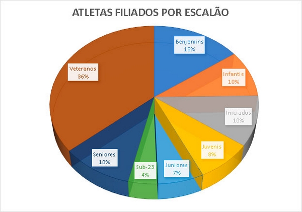 Nestes números, 49,44 % dos filiados pertencem aos escalões de formação, 14,44% pertencem aos atletas seniores (incluindo os sub-23), com os veteranos a somarem 36,12%.