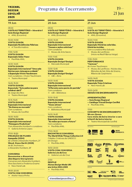 A sessão de encerramento tem lugar na tarde de 21 de junho, no Pavilhão da ANIL, a partir das 15:00, com as apresentações do “Guia de Design Regional” e do “Catálogo da Trienal de Design da Covilhã”.