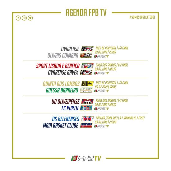 O espetáculo arranca às 15 horas com o Ovarense vs. Olivais Coimbra (15 horas), a contar para os quartos-de-final da Taça de Portugal feminina, seguindo-se mais quatro jogos no nosso canal: SL Benfica vs. Ovarense Gavex (16 horas, meias-finais da Taça Hugo dos Santos), Quinta dos Lombos vs. GDESSA Barreiro (16h45, quartos-de-final da Taça de Portugal feminina), UD Oliveirense vs. FC Porto (18h30, meias-finais da Taça Hugo dos Santos) e Belenenses vs. Maia Basket Clube (21h, Proliga).