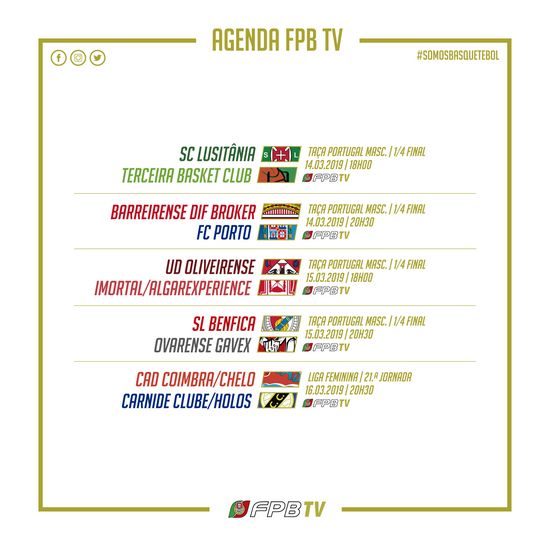 Na quinta-feira o nosso canal vai seguir o arranque dos quartos-de-final da Taça de Portugal masculina, no caso o SC Lusitânia vs. Terceira Basket Club (18h) e o Barreirense Dif Broker vs. FC Porto (20h30), para depois, na sexta-feira, as atenções se focarem no UD Oliveirense vs. Imortal AlgarExperience (18h) e SL Benfica vs. Ovarense Gavex (20h30).