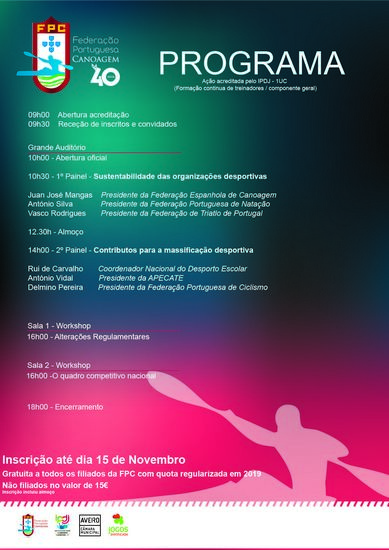 Intregrado nas comemorações dos 40 anos da Federação Portuguesa de Canoagem, este encontro pretende assumir-se como um proveitoso debate de ideias, que possa contribuir para um crescimento ainda maior e mais sustentado de uma modalidade que, nos últimos anos, tem contribuído, de forma constante e meritória, para elevar além-fronteiras o nome de Portugal.