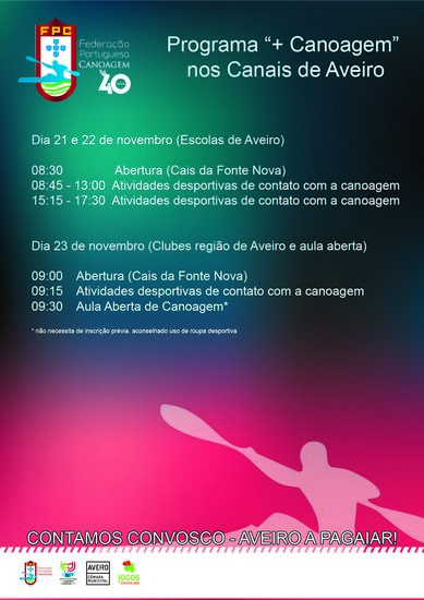 Como tal, nos dias 21 e 22 de novembro, quinta e sexta-feira, os alunos da Escola Secundária Dr. Mário Sacramento e da Escola Secundária José Estêvão, ambas de Aveiro, vão ter a oportunidade de usufruir de atividades desportivas de contato com a Canoagem. No sábado, dia 23 de novembro, o programa inclui, além das referidas atividades, uma aula aberta de Canoagem dirigida a toda a comunidade, que vai contar com a presença e o apoio de quatro clubes do distrito de Aveiro: Sporting Clube de Aveiro, Agrupamento de Escolas de Vagos, Instituto para o Desenvolvimento e Estudos de Cacia e Clube Natureza e Aventura de Ílhavo.