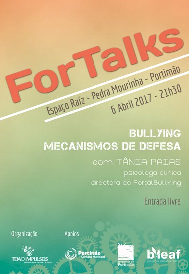 A Teia D’Impulsos – Associação Social, Cultural e Desportiva (TDI), em parceria com a Câmara Municipal de Portimão, a Junta de Freguesia de Portimão e com o apoio da B-Leaf, realiza no próximo dia 06 de Abril, pelas 21.30 horas, no Espaço Raiz, antiga Escola Primária da Pedra Mourinha, o primeiro encontro ForTalks cujo tema assenta na área da Educação: “Bullying e Mecanismos de defesa”.