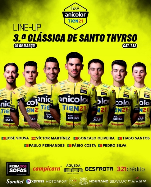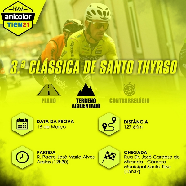 Amanhã, dia 16 de março, a Equipa Profissional de Ciclismo Anicolor / Tien21 está na estrada para disputar a 3.ª edição da Clássica de Santo Thyrso. Serão 127,6 km pelo concelho de Santo Tirso, com um percurso que contempla um circuito com muito sobe e desce, tornando a corrida dura e exigente. Espera-se muito espetáculo e que os adeptos venham à rua, tratando-se de uma terra com forte tradição no ciclismo. Esta será, também, a segunda prova pontuável para a Taça de Portugal.