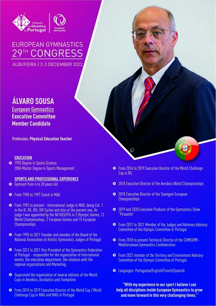 “O congresso realiza-se em Albufeira e a sua organização está a cargo da FGP. Aqui se irá discutir o futuro da Ginástica Europeia. Não serão apenas tomadas decisões sobre questões estratégicas, acontecerá também a eleição das próximas Autoridades da EG. Em termos organizativos, foi tudo previamente planeado e está a desenrolar-se conforme previsto. As expetativas dos participantes são altas, sendo Portugal já conhecido pela hospitalidade e competência. O tempo e o local são também mais valias para o evento.“