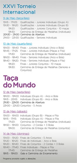 Na semana do arranque do evento ultimam-se os preparativos para aquela que será uma das mais importantes competições internacionais da disciplina de Ginástica Rítmica (GR). Organizada pela Federação de Ginástica de Portugal, pela Câmara Municipal de Portimão e pela Associação de Turismo de Portimão, a Taça do Mundo de Ginástica Rítmica de Portimão irá reunir entre 12 e 14 de Maio perto de uma centena e meia de participantes, provenientes de 12 países. Serão mais de uma dezena de idiomas que se irão fazer ouvir no Pavilhão Portimão Arena, palco deste grande evento, mas que se traduzirão numa expressão única de rara beleza, como aquela que só a Ginástica Rítmica é capaz de proporcionar.