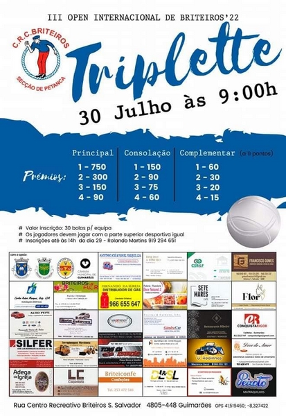 No dia 30 de Julho, a Secção de Petanca – C.R.C.Briteiros realiza o seu III Open Internacional, que deverá ter a participação de mais de 200 atletas de norte a sul e internacionais.