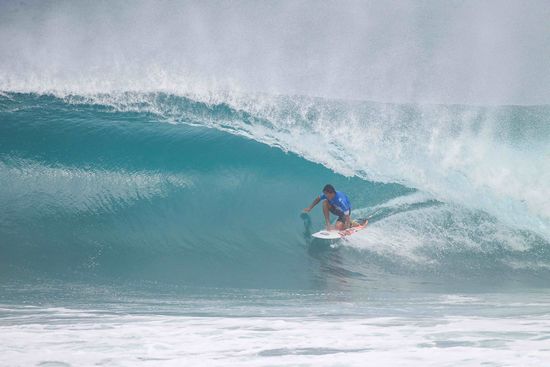 o brasileiro Luel Filipe e o havaiano Joshua Moniz, que conseguiu a melhor onda do campeonato na fase anterior, graças a um tubo incrível, que lhe valeu a única nota 10 de todo o evento.