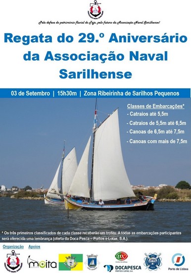 No âmbito das Comemorações do seu 29.º Aniversário, a Associação Naval Sarilhense (ANS) organiza, no próximo dia 03 de Setembro, a partir das 15h30m, na zona ribeirinha de Sarilhos Pequenos, uma Regata de Embarcações Tradicionais do Estuário do Tejo (Catraios e Canoas).