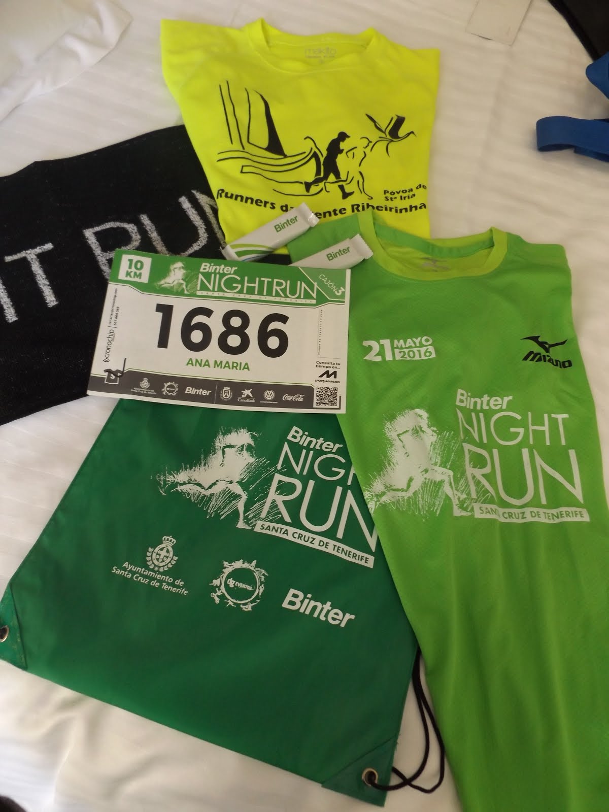 Não acredito. Esta rapariga saloia, dos subúrbios de Lisboa, está aqui, em Santa Cruz de Tenerife e vai participar numa Corrida! É a Binter Night Run e eu estou cá! Aos saltinhos, um nervoso miudinho sem saber porquê e já devidamente equipados - mentira! Falha imperdoável: a bandeira Portuguesa, esse inexplicável orgulho luso que ostento sempre que corro fora deste quintal tinha ficado em casa esquecida! Não importa (muito). Eu estou cá e ostento a t-shirt da nossa Maratona do Porto! Os dorsais e o kit do atleta, incluindo uma bonita t-shirt, já os tínhamos desde a véspera na chegada ao hotel. Tanto o meu como do Manuel Sequeira foram-nos entregues mal chegámos. Dorsais personalizados com o nome (curiosamente o primeiro e o segundo) e com o chip incorporado.