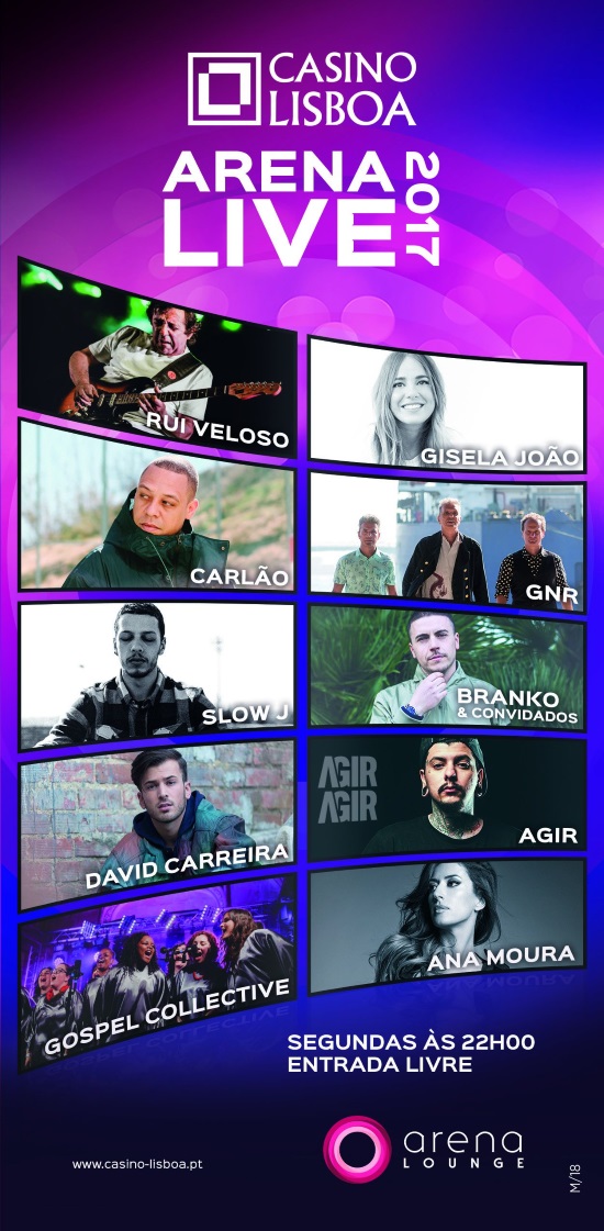 O Arena Lounge do Casino Lisboa acolhe, a partir do dia 30 de Outubro, o ciclo de “Concertos Arena Live 2017”. O programa decorre às Segundas-Feiras, pelas 22h00, excepto na noite de Reveillon. A entrada é livre.