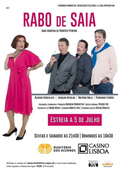 O Auditório dos Oceanos do Casino Lisboa propõe, a partir de 5 de Julho, “Rabo de Saia”. Os espectáculos decorrem às Sextas-Feiras aos Sábados, às 21h30, enquanto aos Domingos estão agendados para as 16h30. M/12.