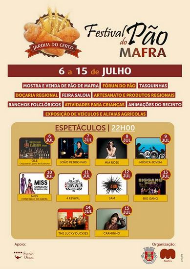 De 6 a 15 de julho, o Pão de Mafra é rei. Está de volta mais uma edição do Festival do Pão que visa divulgar e promover este alimento de excelência, bem como os produtos e tradições locais. Unindo lazer, tradição e divulgação cultural, o festival tem como cenário o belo Jardim do Cerco, com vista para o Real Edifício de Mafra. A entrada é gratuita.