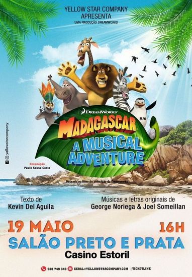 O Salão Preto e Prata do Casino Estoril recebe, no próximo dia 19 de Maio, às 16 horas, “Madagáscar - Uma Aventura Musical”, uma produção da Yellow Star Company. A encenaçãoé de Paulo Sousa Costa.
