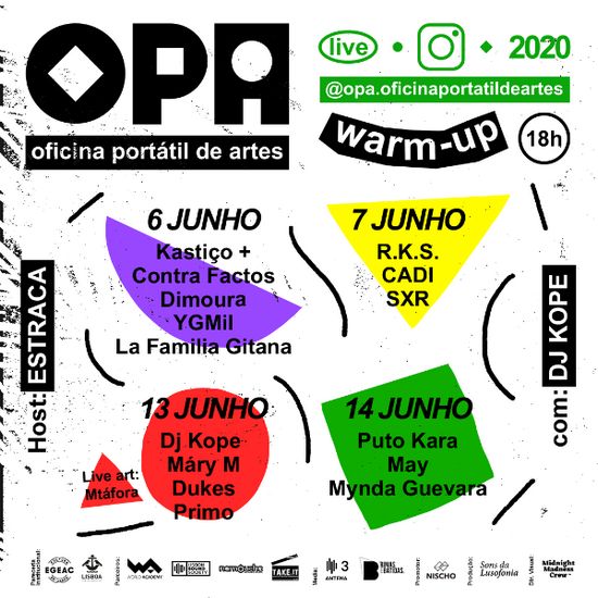 As atuações do Warm Up acontecem nos dias 6 e 7 - 13 e 14 de junho, todas com transmissão em direto a partir do Instagram OPA. Estes concertos além de serem transmitidos de forma digital, acontecem em estúdios de música e espaços ligados à criatividade artística em Lisboa, como Espaço Take.it, Estúdios Namouche, Auditório World Academy e Estúdios Lisbon Sound Society.