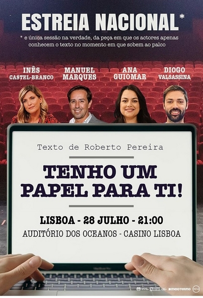 Em estreia nacional, o Auditório dos Oceanos do Casino Lisboa propõe, no próximo dia 28 de Julho, pelas 21 horas, “Tenho Um Papel Para Ti!”. Com um elenco de luxo, estarão em palco Inês Castel-Branco, Manuel Marques, Ana Guiomar e Diogo Valsassina. O texto é de Roberto Pereira.