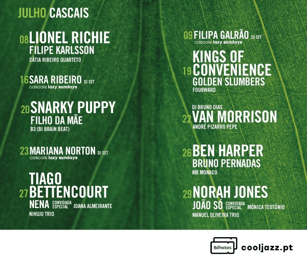 O COOLAZZ recebe ainda este mês Kings of Convenience (19 Julho), Snarky Puppy (20 Julho), Van Morrison (22 Julho), Ben Harper (26 julho) eTiago Bettencourt (27 Julho).