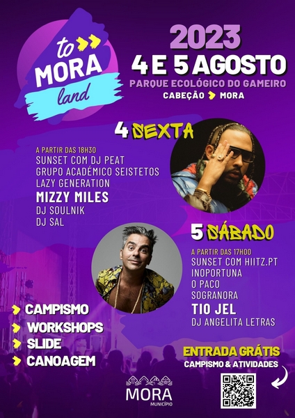Está cada vez mais próxima a segunda edição do festival jovem do Concelho de Mora. To Mora Land, é o novo nome escolhido para este festival, que acontece no Parque Ecológico do Gameiro nos dias 4 e 5 de agosto.