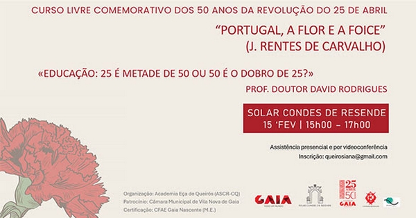 A próxima sessão do Curso livre "Portugal, a Flor e a Foice" (J. Rentes de Carvalho) está a cargo do Conselheiro Nacional de Educação, o Prof. Doutor David Rodrigues.