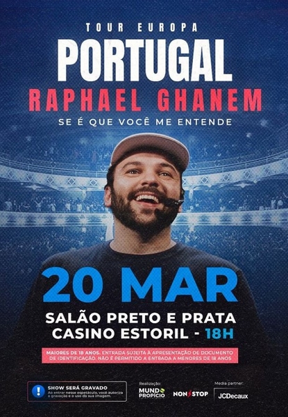 Referência da stand-up comedy no Brasil, Raphael Ghanem apresenta-se, no dia 20 de março, no Casino Estoril. O humorista carioca sobe ao palco do Salão Preto e Prata para protagonizar “Se é que você me entende". Após esgotar o espectáculo das 21h00 foi agendada uma sessão extra para as 18h00.