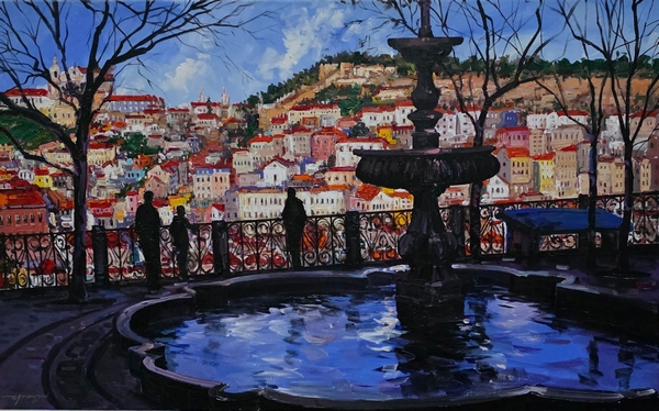 Os bairros, as ruas e os jardins, o Tejo e o Castelo, são transportados para as telas de um modo singular, com uma paleta riquíssima de cores quentes e com uma técnica inconfundível.