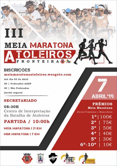 Numa organização da Câmara Municipal de Fronteira, com o apoio técnico da Associação de Atletismo do Distrito de Portalegre, a Meia Maratona dos Atoleiros anima Fronteira no dia 7 de Abril (domingo), a partir das 10 horas.