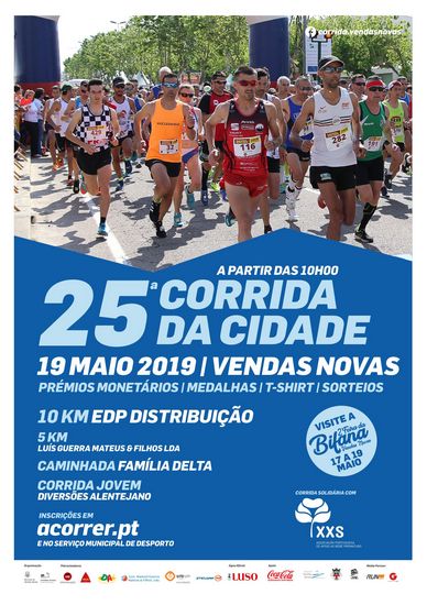 A 25.ª Corrida da Cidade é organizada pelo Município de Vendas Novas, conta com o patrocínio da EDP Distribuição, Delta Cafés, Diversões Alentejano, Luís Guerra Mateus & Filhos Lda, Etelgra, água oficial Luso; apoio da Coca-Cola, Juntas de Freguesia de Vendas Novas e Landeira; organização técnica da Werun e da Associação de Atletismo de Évora; colaboração da GNR, Bombeiros Voluntários, e tem como media partner a Rádio Granada e a RUNning Magazine.
