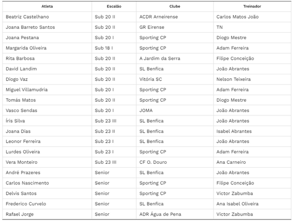 Estão convocados os atletas: Carolina Ventura, Iara Vacondeus, Laura Agostinho, Margarida Oliveira, Beatriz Castelhano, Joana Barreto Santos, Joana Pestana, Rita Barbosa, David Landim, Diogo Vaz, Tomás Matos, Vasco Sendas, André Prazeres, Carlos Nascimento, Delvis Santos, Frederico Curvelo.