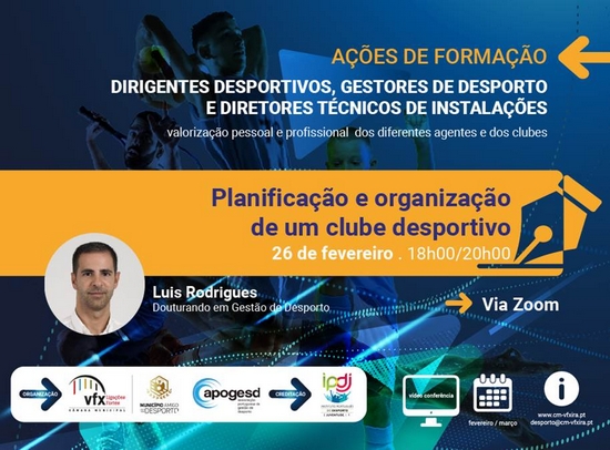A Câmara Municipal de Vila Franca de Xira organiza, no próximo dia 26 de fevereiro (6.ª Feira), das 18h00 às 20h00, a ação de formação "Planificação e organização de um clube desportivo", numa parceria com a Associação Portuguesa de Gestão de Desporto (APOGESD) e com creditação do Instituto Português do Desporto e Juventude (IPDJ).