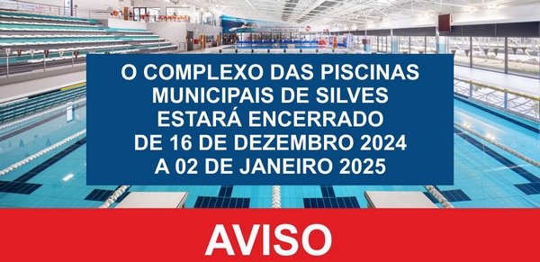 O Município de Silves informa que o Complexo das Piscinas Municipais de Silves irá encerrar entre os dias 16 de dezembro 2024 e 02 de janeiro de 2025.