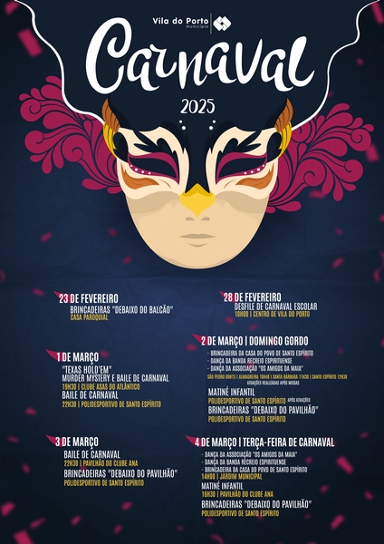 O Município de Vila do Porto apresenta a programação, de várias entidades do concelho, para o Carnaval  2025, que decorre de 23 de fevereiro a 4 de março.