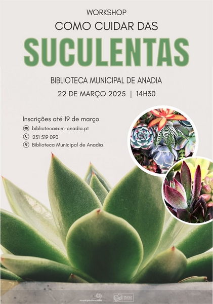 Dando continuidade ao ciclo de workshops, a Biblioteca Municipal de Anadia recebe, no próximo dia 22 de março, pelas 14h30, mais uma ação, desta feita subordinada ao tema “Como cuidar das suculentas”, orientada por Vera Ferreira.