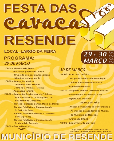O Município de Resende convida todos a participar na tão aguardada Festa das Cavacas, que este ano se realiza nos dias 29 e 30 de março, no centro da vila de Resende.