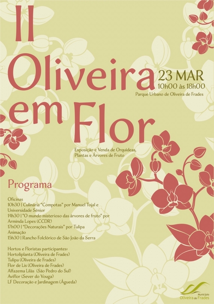 Oliveira de Frades: II Oliveira em FlorPublicado em quinta-feira, 6 de março de 2025 | Imprimir No próximo dia 23 de março (domingo), o Município promove a segunda edição do “Oliveira em Flor” no Parque Urbano, entre as 10h00 e as 18h00. Esta iniciativa contará com a exposição e venda de orquídeas, plantas e árvores de fruto, de diversas oficinas e animação musical fShare Tweet Anterior Seguinte