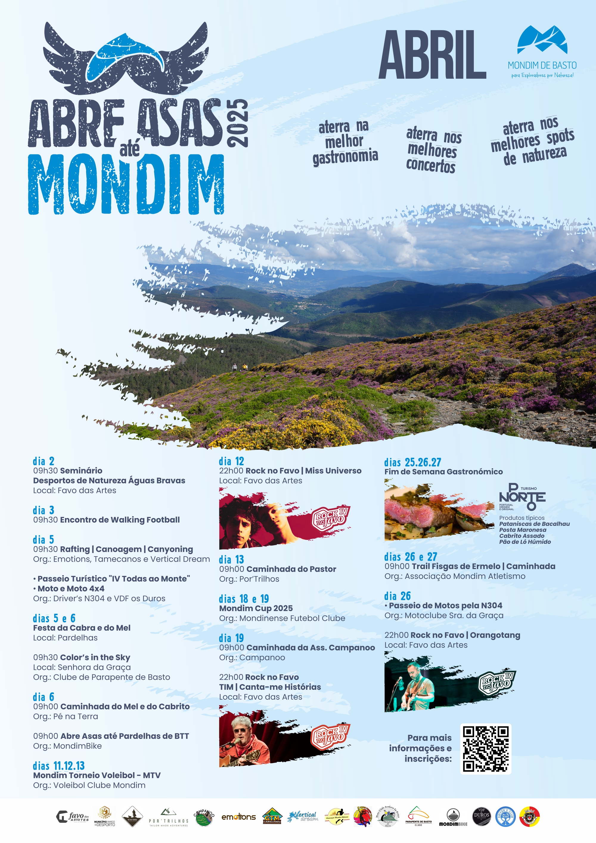A 4ª edição do “Abre Asas até Mondim” vai desenvolver-se durante todo o mês de abril, com um programa de atividades que convidam a explorar o território, a gastronomia e a genuinidade das gentes de Mondim de Basto.