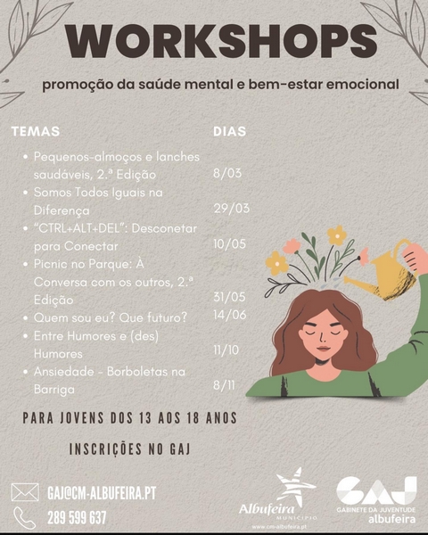 O Município de Albufeira, através do GAJ – Gabinete da Juventude de Albufeira está a organizar vários Workshops destinados a jovens com idades compreendidas entre os 13 e os 18 anos, com o objetivo de promover o bem-estar e a saúde mental nesta faixa etária da população.